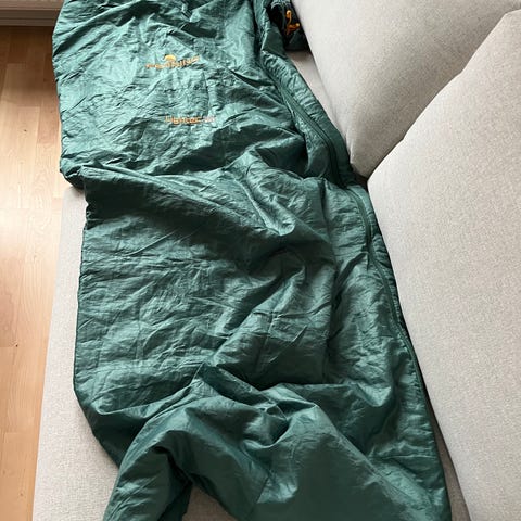 Denne vare er en sovepose i camouflageprint, der er designet til udendørs brug. Den har en lynlås i siden for nem adgang og en snøre i toppen til justering. Soveposen er i et mønster af grønne og sorte nuancer, der giver et militærinspireret look. Der medfølger også en matchende rygsæk i samme camouflageprint, som har lynlåslukning og stropper. Rygsækken er mærket med 'RYGSÆK, LILLE M/99 CQC 1999 HIV'.