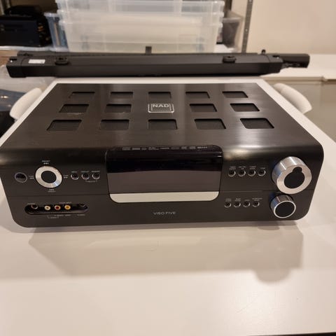 NAD Stereo Receiver 7020e. Super lækker lyd, men lidt knas på volumendrejeknappen og Phono-kontakten er utæt i den ene kanal. Kan repareres eller anvendes uden phono-kanalen eller til reservedele.