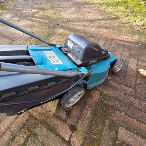 Makita PLM4814 , kan ikke starte den skal repareres benzinplæneklipper i blå farve. Plæneklipperen er udstyret med Briggs & Stratton-motor og har træk i hjulene. Modellen har opsamler bagpå til græsafklip og justerbart styr med håndtag. Egnede anvendelser er almindelig græsslåning i have og på mindre græsarealer.