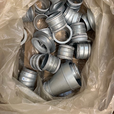 Sæt ventilationsrør og bøjninger i galvaniseret stål. Består af flere lige spiralfalsede rør i forskellige længder samt flere bøjninger og muffer. Velegnet til brug i ventilations- eller udsugningsanlæg, hvor der ønskes kanalføring i metalrør. Farven er metalgrå fra det galvaniserede stål. 7 stk ø100 a 2 meter. 1 stk 90 grader bøjning i 160mm