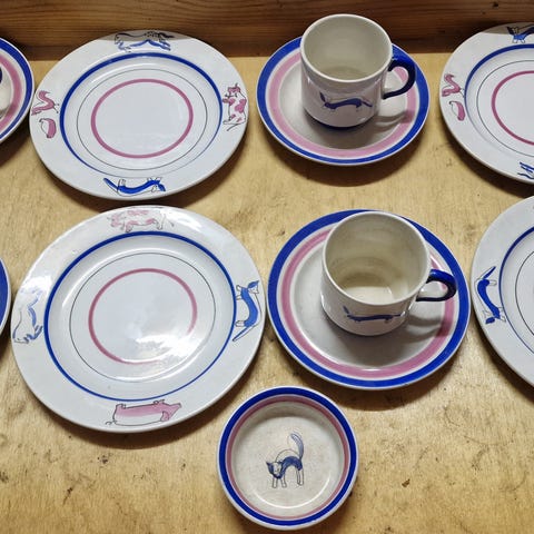 Gabriel Burmeister, Sjældent set sæt af 6 mindre tallerkener og 1 fad . Svensk keramik i topklasse. Gabriel Burmeister. Uhørt flot stand. Få alderstegn. Fra 1930'erne.