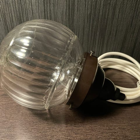 Loftslampe med gammel glasskærm, kugleformet i marmoreret glas, og ny messing fatning/glasholder i vintage look, ny pinol aflaster i messing.
