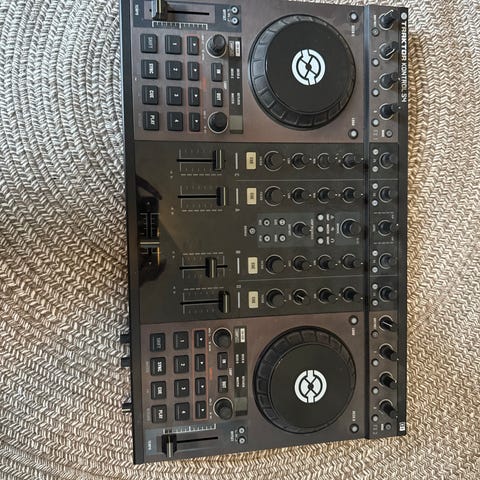 DJ controller i sort. Enheden har to joghjul, mixersektion i midten med fadere og knapper samt performance-knapper på hver side. Velegnet til digital dj-brug med computer eller anden kompatibel enhed, afhængigt af understøttet software og tilslutningsmuligheder.