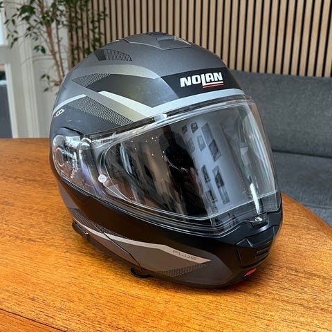 Meget fin stand,Nolan N104 EVO Classic N-Com motorcykelhjelm i størrelse S. Hjelmen er en integral-/flip-up model med klart visir og indbygget solvisir. Farven er mat sort. Modellen er forberedt til N-Com kommunikationssystem. Vægten er angivet til ca. 1550 g. Leveres med Nolan hjelmpose som vist på billederne.