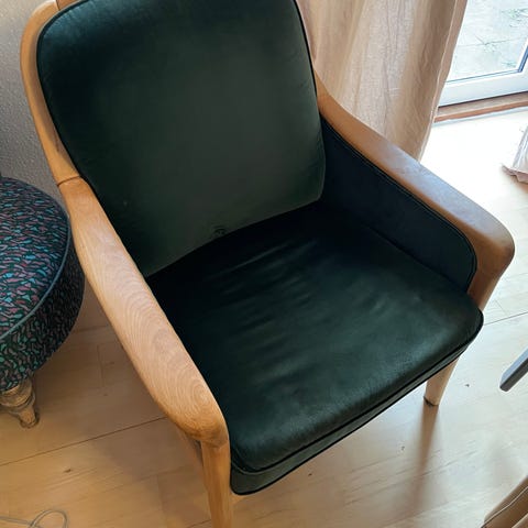 Flot og hyggelig grøn lænestol sælges. Klassisk model med bløde armlæn og fine træben.