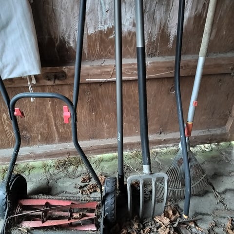 Haveværktøj sæt bestående af forskellige redskaber til havearbejde. Sættet omfatter håndbørster, en metalrive til planering eller samling af græs og jord samt beskæresakse og andre håndredskaber til klipning og trimning af grene og planter. Velegnet til generel vedligeholdelse af have og græsplæne. Lad os snakke om prisen