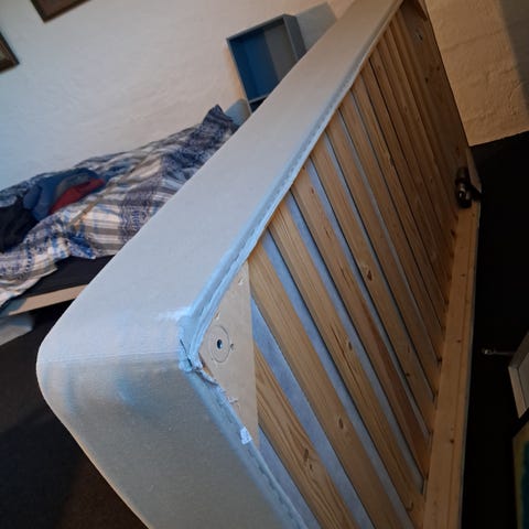 Jysk boxmadras i grå tekstil. Madrassen har indbygget lamelbund med træramme, som ses på undersiden. Velegnet som enkeltseng eller som del af en dobbeltseng ved brug af to madrasser. Passer til standard sengeben og sengegavle, der kan monteres på rammen, afhængigt af beslag og tilbehør.
