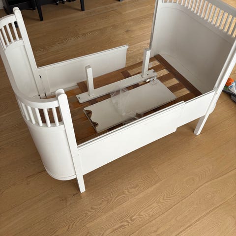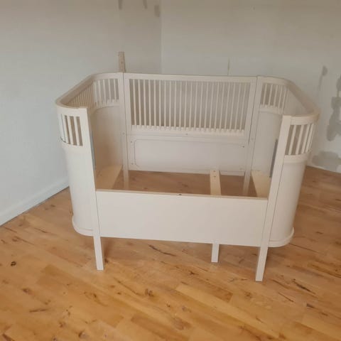 Sebra tremmeseng i klassisk design. Sengen har tremmesider og bund, som kan ses på billederne. Egnet som seng til baby og mindre barn. Farven fremstår i lyse nuancer med tremmer i kontrastfarve. Materialet er træ/mdf-lignende plader og rundstokke. Der kan forekomme brugsspor og mærker på sider og sengebund, som vist på billederne. Velegnet til brug i børneværelse som fast seng eller ekstra seng.