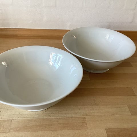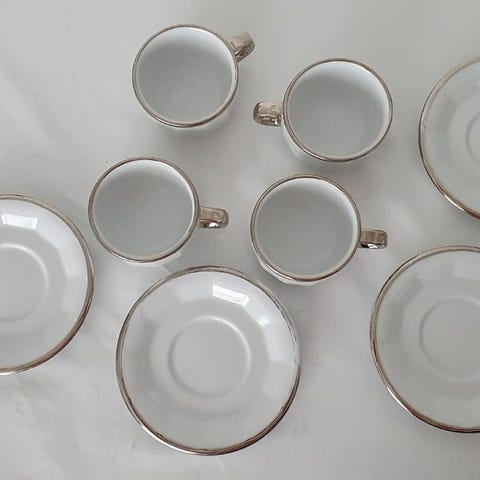 Sættet består af seks bægre på fod, velegnede til fx drikkeglas eller små serveringer. Fremstillet i glaseret porcelæn med stempel i bunden, der angiver, at serien er fransk.