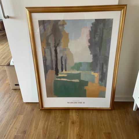 Plakat af Dronning Margrethe med landskabsmotiv i guldfarvet ramme