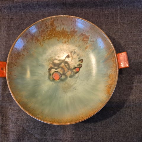 Dekorativ keramikskål med håndmalet blomstermotiv i bunden. Skålen har en mat, naturfarvet og grønlig overflade med patina. Bagsiden er forsynet med ophæng, så skålen kan bruges som vægdekoration. Velegnet som dekoration i hjemmet, enten stående på bord eller hængende på væg. Mærke og model er ikke angivet.