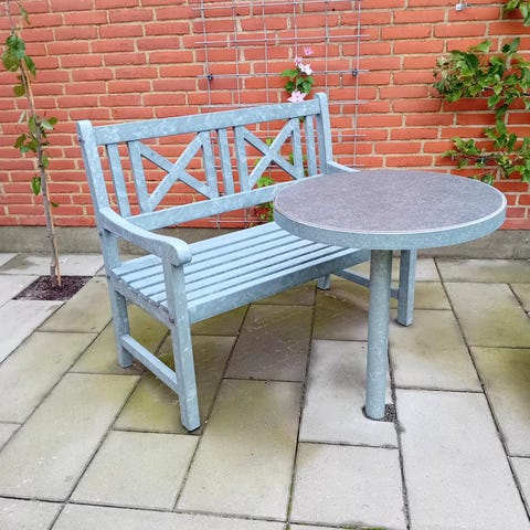 Havemøbelsæt bestående af en lille bænk, et rundt sidebord og to høje krukker i grå polyrattan. Bænken har armlæn og flettet sæde og ryg i polyrattan på metalstel. Det runde bord har metalstel og rund bordplade i grå. De to høje krukker er kvadratiske med inderskjulere og flettet yderside i grå polyrattan.