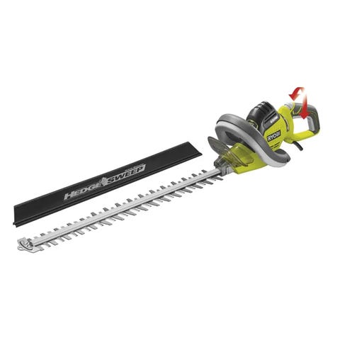 Ryobi hækkeklipper med 650W motor og ledning. Modellen har tohåndsgreb og lang klinge med medfølgende klinge-beskytter. Velegnet til trimning og formklipning af hække og buske i haven. Tilsluttes almindelig stikkontakt via netkabel.