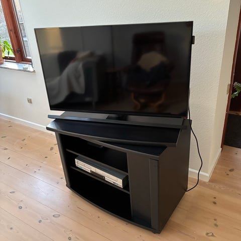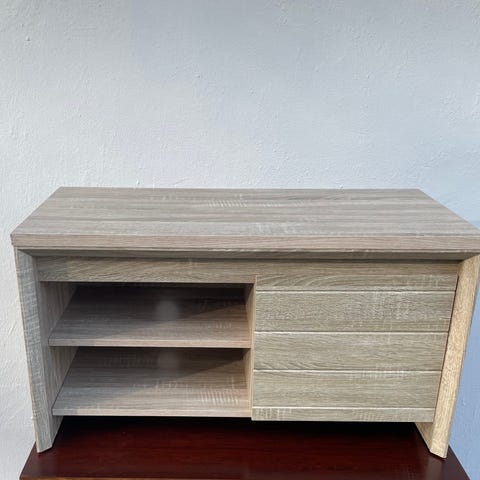Lille TV møbel på hjul med plads/hul til ledninger i bagplade. Mørkt træ.
