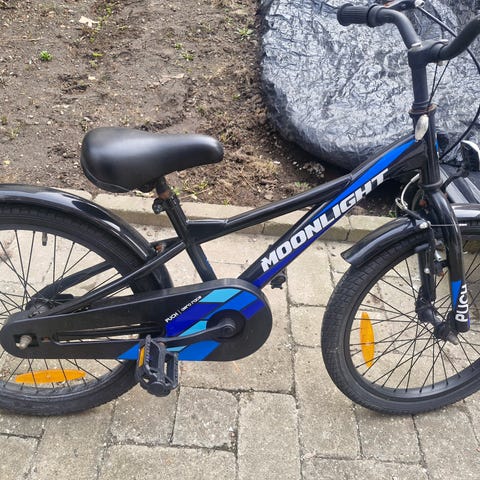 Moonlight børnecykel med 20" hjul. Cyklen har stel i sort med guldgaffel og lige styr med håndbremse foran. Udstyret med kædetræk, støtteben og dæk med mønster egnet til kørsel på vej og fast underlag. Velegnet som hverdagscykel til barn, der passer til 20" hjulstørrelse.
