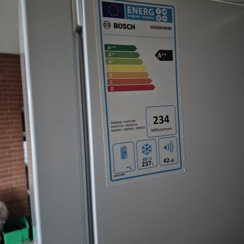 Bosch skabsfryser i hvid. Fryseren har flere skuffer nederst og hylder øverst, hvilket giver mulighed for både opbevaring i lukkede skuffer og på åbne hylder. I døren er der ekstra hylder til mindre varer. Energimærkningen på siden angiver A+. Velegnet som ekstra fryseplads i fx bryggers eller garage. Modelbetegnelse fremgår delvist af mærkaten på siden, men er ikke fuldt læsbar.