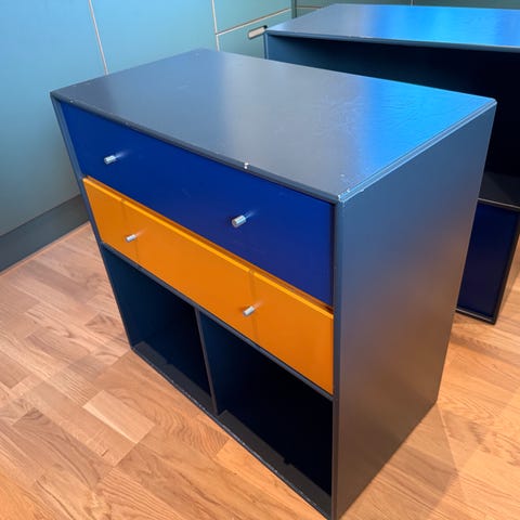 Den anden med 2 skabslåger, skuffe i sort og 2 tynde metalskuffer. Dette skab har lidt flere brugsspor/ridser, samt et hak i det ene hjørne. Vi har haft et skumhjørne siddende på for at beskytte. Forsat lidt rester som ikke er taget af endnu. Se billede.