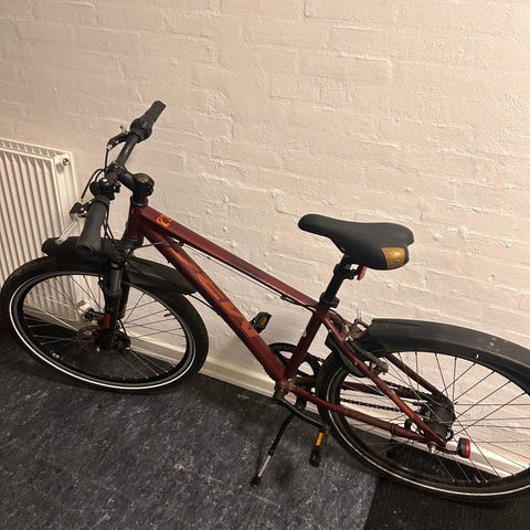 Den har affjedret forgaffel, skivebremser for og bag samt gearsystem med udvendige gear. Der er monteret støtteben og skærme både for og bagt. Velegnet som større børne- eller juniorcykel til hverdagskørsel og ture i skoven :o)