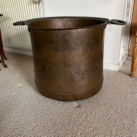 Kobbergryde på jernstativ med hanke grukedel