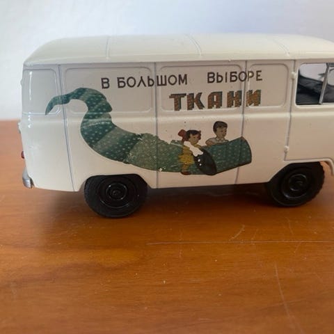 En sjov russisk pige, som kan trækkes op - og kører lidt trægt. Selve dukken har det fint - æsken har set bedre dage og mangler toppen.