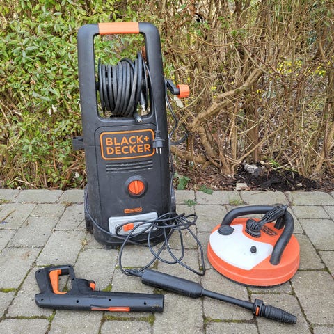 Black+Decker højtryksrenser i orange plastkabinet. Maskinen har et maksimalt tryk på 120 bar / 1740 PSI, som egner sig til rengøring af fx terrasser, indkørsler, havemøbler og køretøjer. Enheden har bærehåndtag og hjul for nem transport. Medfølgende tilbehør på billederne omfatter sprøjtepistol og beholder til rengøringsmiddel. Velegnet til almindelige rengøringsopgaver omkring hus og have. Aldrig brugt. Afhentes i Bramdrupdam, Kolding