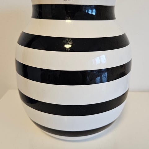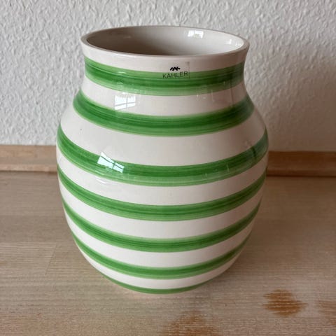 Kähler Omaggio vase i keramik/porcelæn. Vasen er hvid med vandrette guldstriber. Egnet til dekoration eller til mindre buketter og enkelte blomster. Klassisk Kähler-design med logo i bunden.