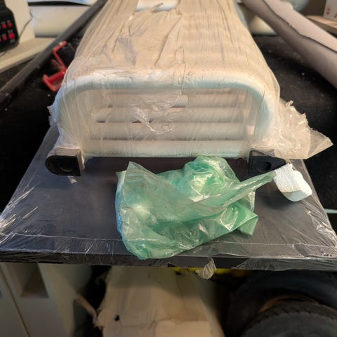 Hudevad radiator med tilhørende hvid frontplade. Radiatoren har lodrette lameller på bagside og tilslutninger i bunden. Frontpladen er udstyret med tre metalknager, som kan bruges til ophæng af for eksempel håndklæder. Egnet til montering i rum, hvor der ønskes både opvarmning og enkel ophængsmulighed.