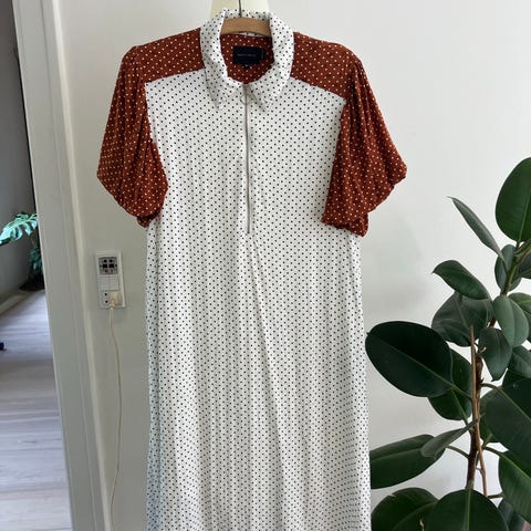 Birgitte Herskind flot kjole i det smukkeste stof. Stoffet har prægede blomster. Str. S. Har fine ballonærmer og underkjole. 100% viskose. Style: Lennon dress. Brugt en gang.