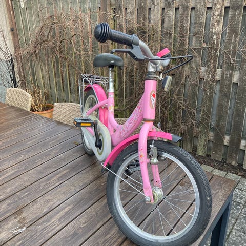 Puky børnecykel 16" i grøn. Den er brugt, og selvom den har stået inde, har den fået lidt rust. Bremser og håndbremse fungerer dog, som de skal, men den trænger til lidt luft i dækkene.