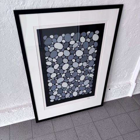 Plakaten er en kunstnergodkendt reproduktion af originalerne fra kollektionen Art Line, som var et resultat af et samarbejde mellem Verner Panton og Ege Axminister. Kollektionen bestod af tæpper med Pantons “Stones 1” og “Stones 2” motiver, hvor den første var i flere farver, mens den sidste var en grå nuance version af samme mønster.