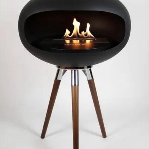 Loftophængt oval pejs i hvid fra Decoflame, som er brugt få gange i et showroom. Der medfølger 8 dunke med bioethanol. Kan købes til halv pris