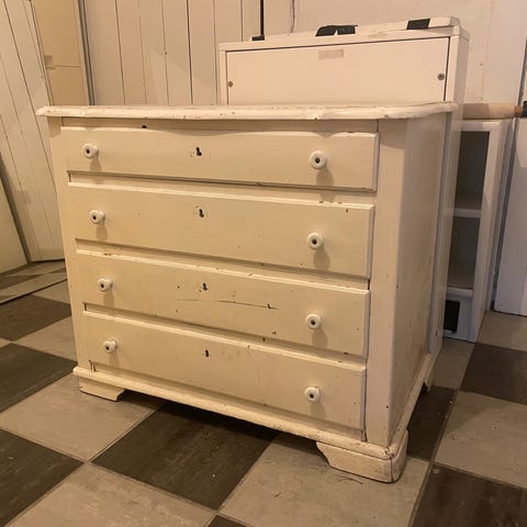 Sød, gammel, sortlakeret kommode med dybe, rummelige skuffer, som binder lidt, og fint svungne skuffegreb.