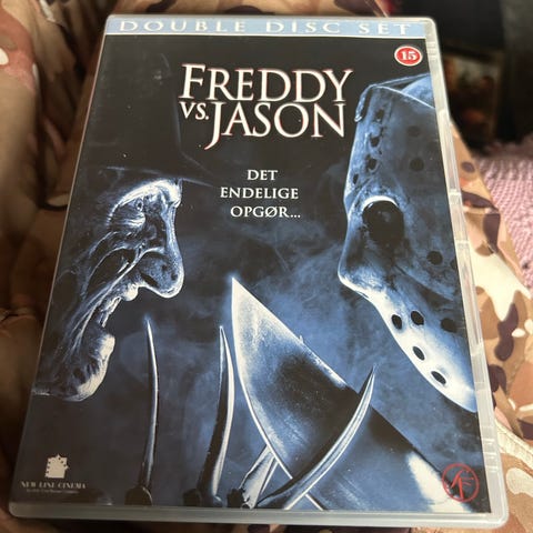 Freddy vs. Jason dvd film. Horrorfilm med dansk titel "Det endelige opgør". Fysisk dvd-udgivelse med aldersmærkning 15+. Velegnet til afspilning på dvd-afspillere, der understøtter standard dvd-format.
