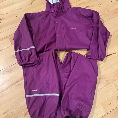 CeLaVi regnsæt i lyserød til børn, unisex, str. 110 (ca. 5 år). Sættet består af jakke med hætte og lynlås samt bukser med elastik i taljen. Materialet er 100 % genanvendt polyester ifølge mærkningen. Jakken har navneskilt indvendigt, og bukserne har elastik ved anklerne samt refleksdetalje på benet. Velegnet som praktisk overtøj til vådt og blæsende vejr.