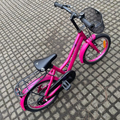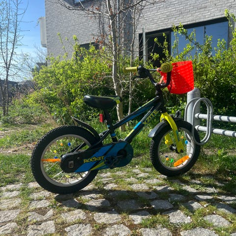 Børnecykel med 16" hjul i grøn farve med blå detaljer. Cyklen har lav indstigning, støtteben, bagagebærer og skærme. Velegnet til mindre børn, der er klar til at cykle uden løbecykel eller støttehjul, afhængigt af barnets højde og erfaring.