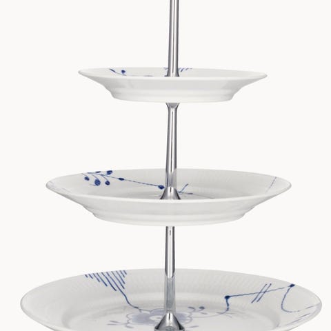 Royal Copenhagen kageopsats i porcelæn i klassisk blå/hvid dekoration. Opsatsen består af tre runde tallerkener monteret på metalstang. Velegnet til servering af kager, småkager, frugt eller andre anretninger på bordet. Designet matcher øvrigt stel fra Royal Copenhagen i blå/hvid dekoration.