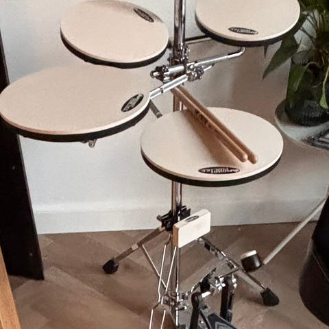 Drumeo trommesæt øvepakke med øvepads, pedaler og trommestikker.