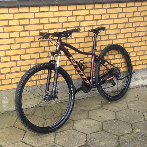 Scott mountainbike til unisex i str. L med 29" hjul. Cyklen er udstyret med brede dæk og forgaffel med affjedring, egnet til kørsel i terræn og på skovstier. Størrelse L passer typisk til voksne ryttere. 29" hjul giver god stabilitet og fremkommelighed på ujævnt underlag. Cyklen har fladt styr og sportslig geometri, som er velegnet til mountainbikekørsel og træning.