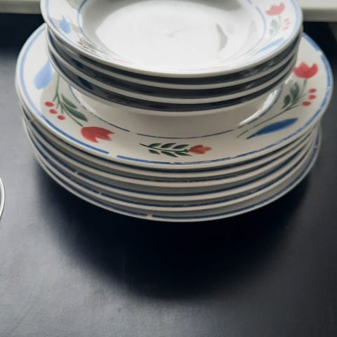 6 stk. dybe IKEA tallerkner med blå blomst motiv. Tallerkenen er rund med let bølget kant og klassisk blåt blomstermønster på flødehvid baggrund.