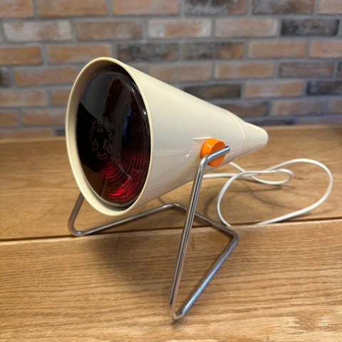 Ældre vintage varmelampe fra Philips, produceret i Holland. Lampen er en klassisk infrarød behandlingslampe som tidligere blev brugt til varmebehandling af muskler og led. Den giver en behagelig infrarød varme og kan justeres i vinklen.