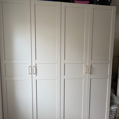 IKEA garderobeskab i hvidt design. Skabet består af flere sektioner med både hængestang til tøj på bøjler og hylder til sammenlagt tøj eller opbevaringskasser. Nogle af lågerne har integrerede spejle, og alle låger er med greb i matchende hvid farve. Velegnet til opbevaring af tøj, sko og tilbehør i soveværelse, børneværelse eller entré.