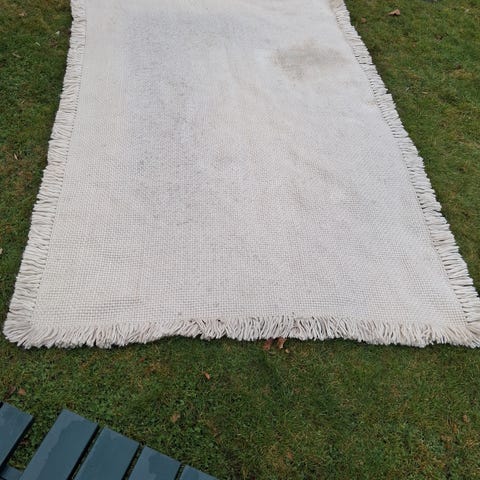 Fint lyst bomuædsvævet gulvtæppe med frynser. På den ene side er den som nyt og på den anden side har den få pletter, som ikke er forsøgt renset.