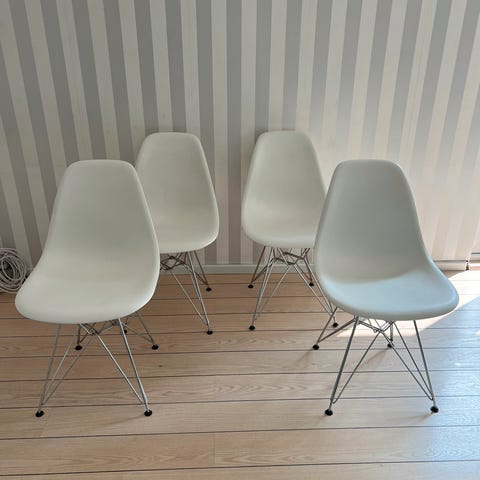Sælger to fine Eames spisebordsstole med træben. De er totalt behagelige at sidde på og funktionen fejler intet.