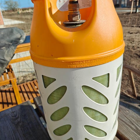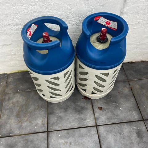 Gasflaske i komposit, sæt med 2 stk. Farve orange/hvid med beskyttende yderkappe og ventil i toppen. Egnet til brug med gasgrill, campingudstyr eller andre gasapparater.