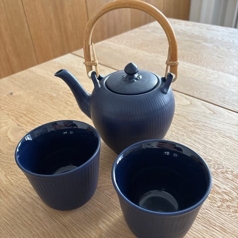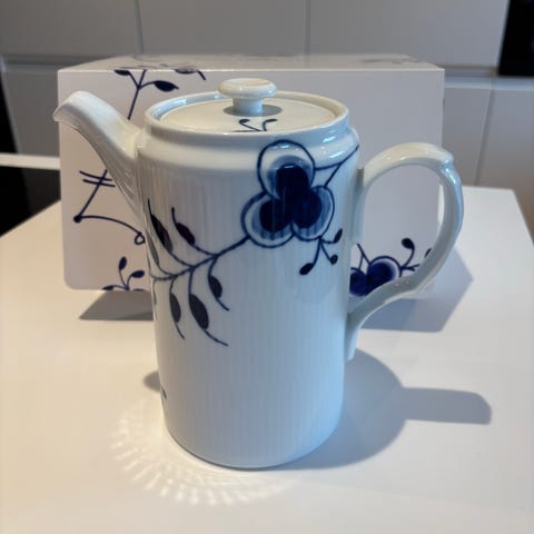 Royal Copenhagen tekande i blåriflet glasur. Denne kande er udgået af sortimentet og var en jubileums kande. Ingen fejl eller skår.