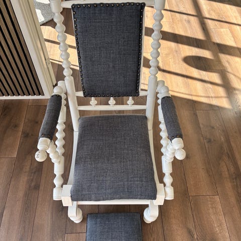 Hvid gyngestol med blå damask uldbetræk.