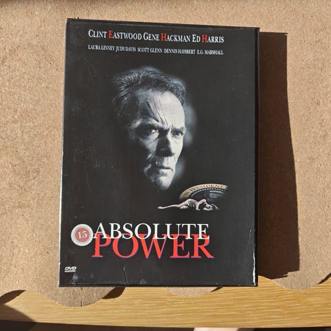 Absolute Power dvd med spillefilmen "Absolute Power". Fysisk dvd-udgivelse i standard dvd-cover. Forsiden viser filmens titel og hovedrolleindehaver, bagsiden indeholder kort resumé, billedmateriale og tekniske oplysninger om filmen og dvd’en, herunder aldersgrænse 15 år.