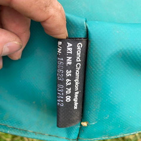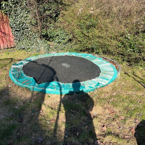 Trampolin gives væk. Fungerer fint men skal repereres da sikkerhedsnettet trænger til udskiftning. Stoffet rundt om trampolinen er også slidt men har ingen effekt ift at kunne hoppe på den