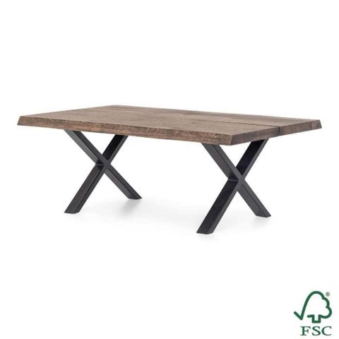 Rigtig flot sofabord med planker i egetræ. Sorte metalben i kryds. Få brugsmærker på bordet. Sælges kun fordi det er for langt til vores sofa.