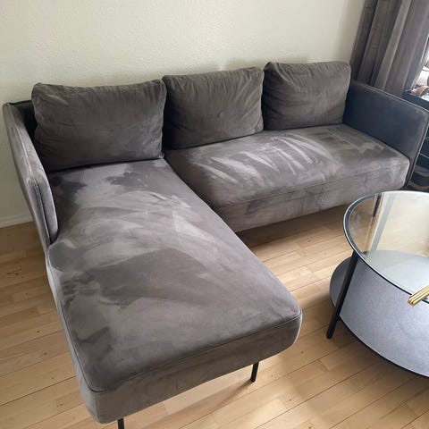 Sort velour sofa med messing ben. Farven er som det første billede trods den både ser blå og grå ud på de andre billeder. Den er i god stand trods et par pletter, men betrækket kan lynes af og vaskes.